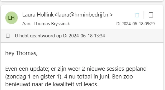 "Ik heb namelijk een coaching bedrijf en daar komt heel veel sales aan te pas. En dat ligt me eigenlijk totaal niet. Vooral het zoeken naar nieuwe klanten was echt zo frustrerend. Ik kreeg vaak nieuwe klanten via Instagram maar dat is totaal niet voorspelbaar. Tot ik het traject ging opzetten bij Thomas. En na het opzetten haal ik automatisch 5 a 10 intakes per week binnenhaal! Dit gaat op basis van een funnel. En op die manier haal ik dus leads binnen die al warm zijn. Hierdoor kan ik me echt focussen op mijn bedrijf. Ik heb een omzet waarop ik kan vertrouwen door de voorspelbare nieuwe klanten. En dat is iets wat zo fijn is!"